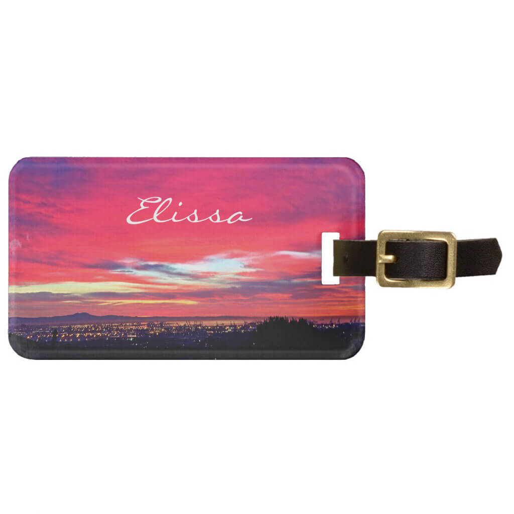This Bag Tag is printed with a pink sunrise photo with a name to customize. Also available with a backside slot for a business card. This Luceworks item is able to be modified and personalized on Zazzle. Discount codes and coupons are often available. Use the “Buy” button to click through to Zazzle to customize item, check for discounts, read full product details, and to complete purchases.